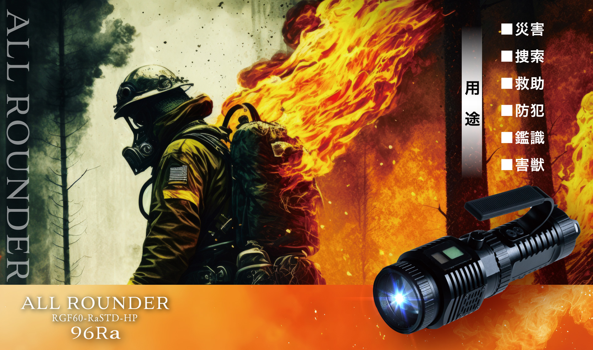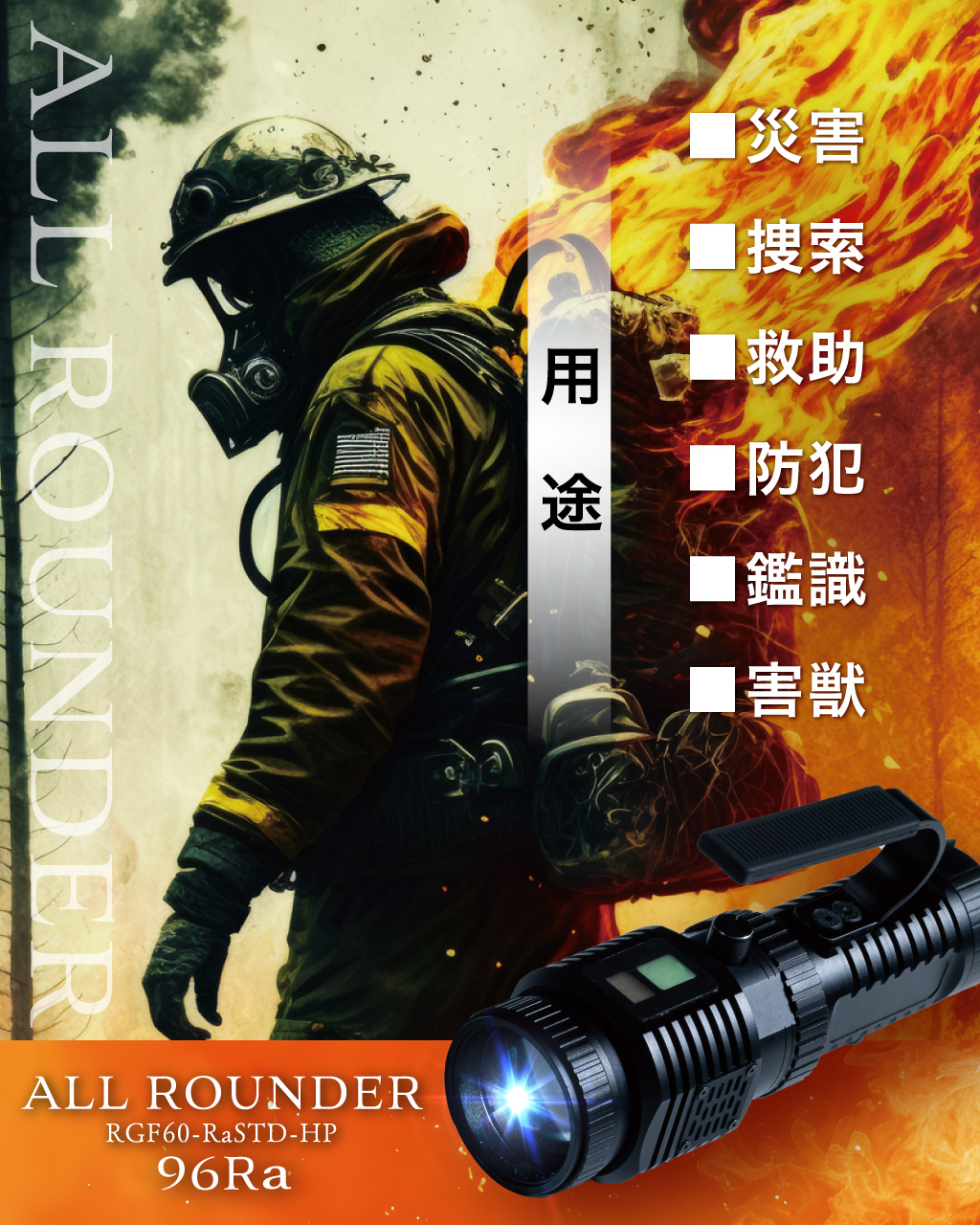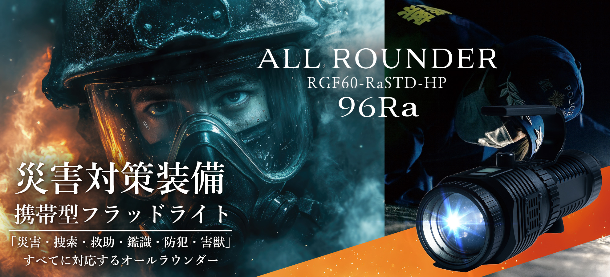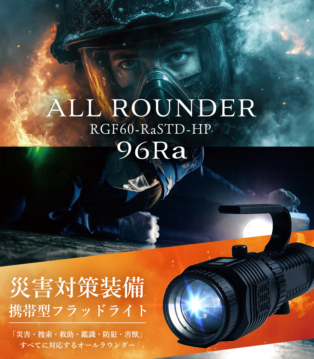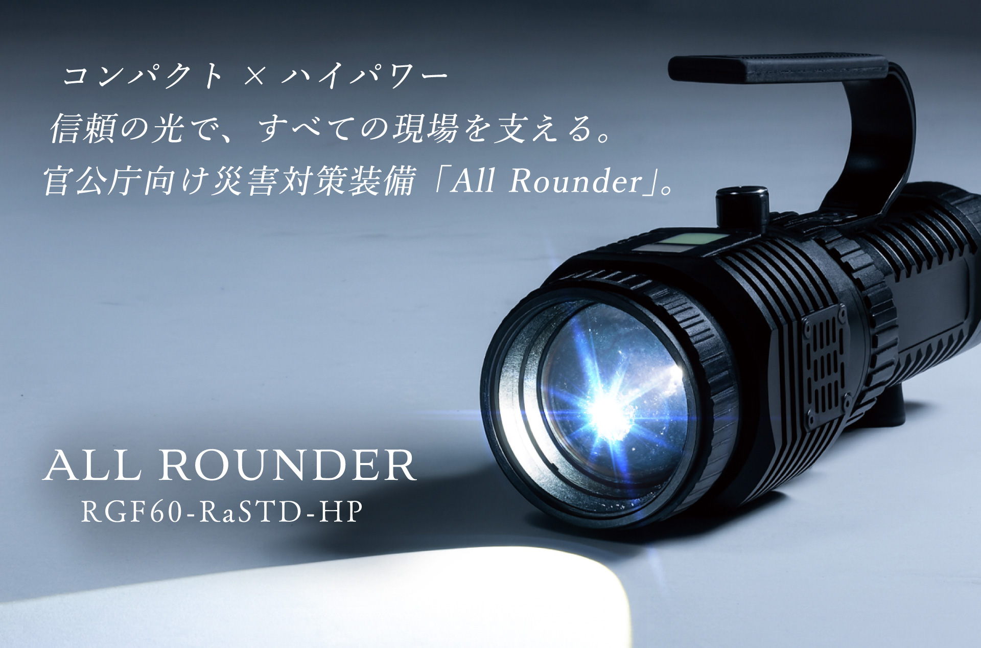 ALL ROUNDER -オールラウンダー- は、災害対策装備の携帯型フラッドライトです。コンパクトなサイズながら、広大なエリアを力強く照らし出すことができる多目的ハイパワーライトです。